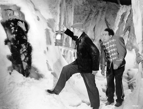 Cold shivers: Dr Niemann (Boris Karloff) and hunchback assistant Daniel (J Carrol Naish) discover the Monster (Glenn Strange) preserved in an underground glacial ice cavern in House of Frankenstein (Universal 1944)